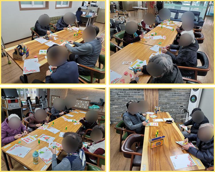 겨울에 피는 동백꽃을 직접 오리고 붙여서 만들어 보고 계신 어르신들의 모습입니다.