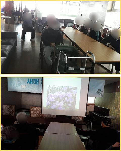 빔 프로젝트를 보시면서 꽃의 이름과 피는 달을 맞춰보고 계신 어르신들의 모습입니다.
