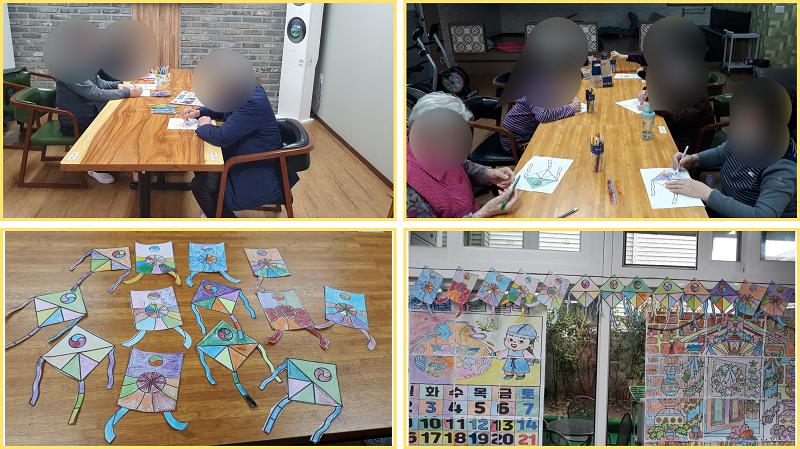 다가오는 설을 대비하여 연을 직접 칠하고 오려보고 계신 어르신들의 모습입니다.