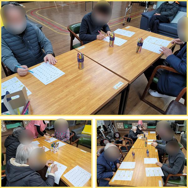 활동지의 글자판에서 재시된 단어와 봄과 관련된 속담을 따라써보고 계신 어르신들의 모습입니다.