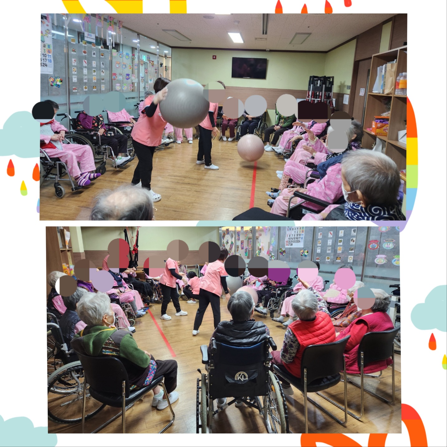어르신들의 짐볼운동 프로그램 활동 모습입니다.