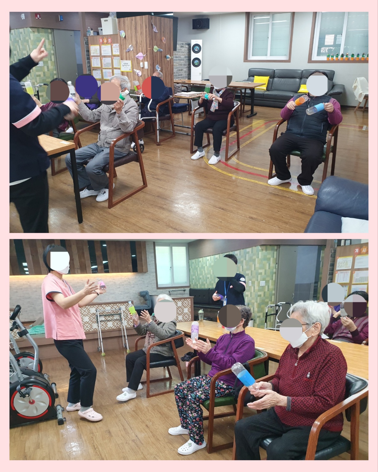 어르신들의 물병체조 프로그램 활동 모습입니다.