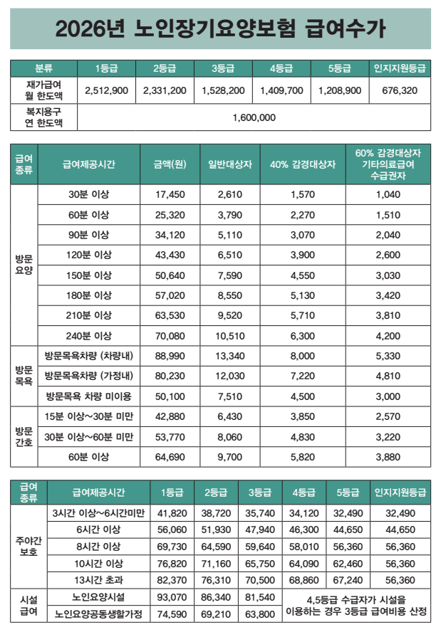 안녕하세요. 시니어재활요양센터입니다. 보건복지부 고시에 따라 2026년 1월 1일부터 노인장기요양보험 급여수가가 조정됨을 안내드립니다.
