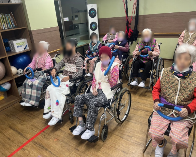 또 다른 저희 시설의 재활운동인 스모비 운동입니다. 전신의 균형감각과 움직임을 자극하여, 일상에서의 안정성과 활동성을 높이는 데 도움이 되는 재활프로그램입니다.