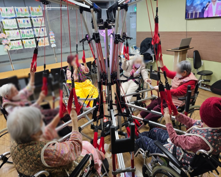 재활운동기구를 사용하여 신나는 트로트 음악을 들으며 재활운동을 열심히 하시는 어르신의 모습입니다.바디힐더는 근력운동과 재활운동에 효과적이며 탄성로프를 적용하여 유연성과 관절 통증에 도움을 주는 기구입니다. 또한 자체조명효과와 음악(트로트)을 들으며 즐겁게 운동을 임할 수 있는 효과적인 기구운동입니다 |
