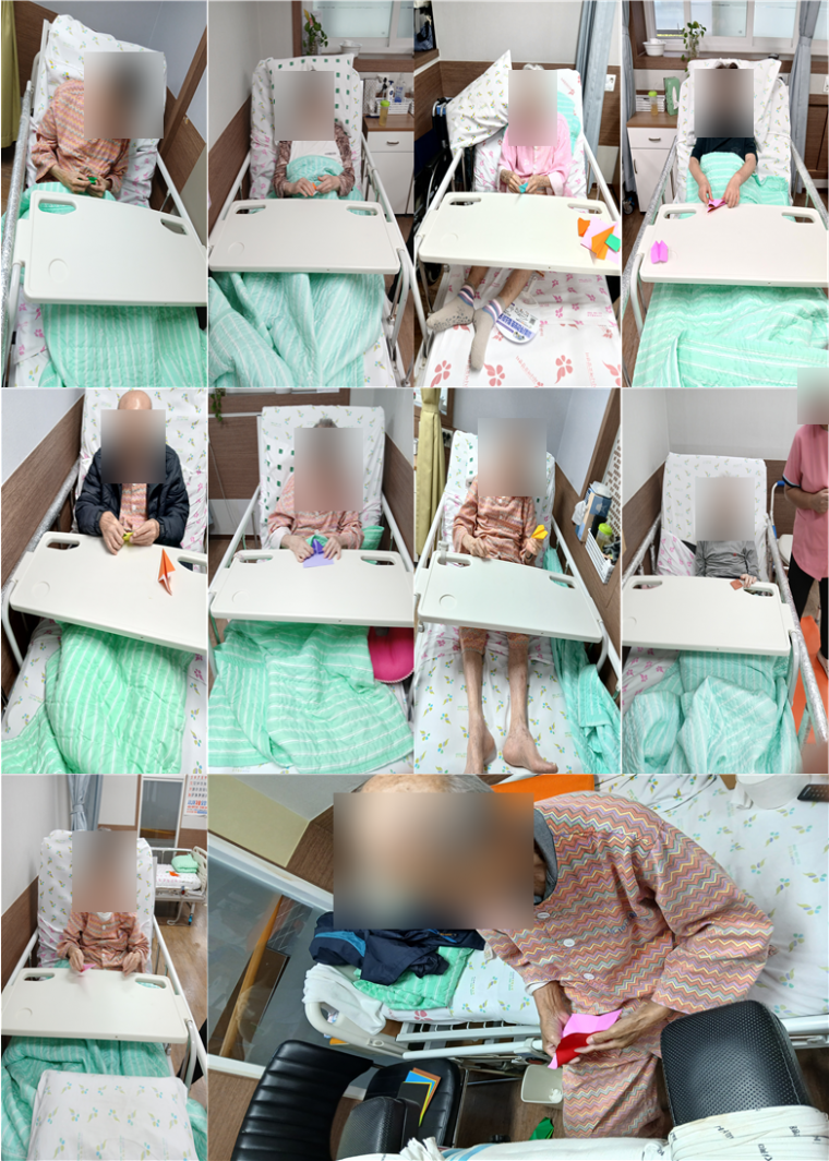 색종이 접기는 손과 눈의 협응력 향상을 도모하고 인지 능력 향상과 기억력 증진을 목표로 합니다. 그리고 색종이 접기를 완성한 후 성취감 및 자존감 향상을 도모하는 프로그램입니다.