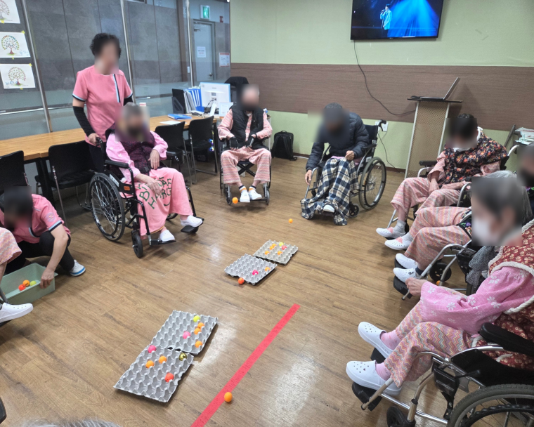 어르신들이 탁구공을 던져 바닥에 튕겨서 통안에 옮기면서 팔과 손근육의 발달시키고 집중력 향상에도 도움이 되는 프로그램입니다.