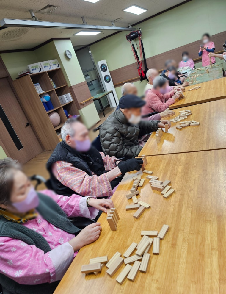 기억력, 집중력, 문제 해결 능력에 도움, 인지 기능 저하를 예방합니다. 그룹 활동을 통해 어르신들 간의 소통과 유대감 증진을 도모합니다. 팔과 손의 힘을 사용하고, 신체 기능 저하를 방지합니다. 놀이를 통해 스트레스 해소와 정서적 안정을 지지합니다.