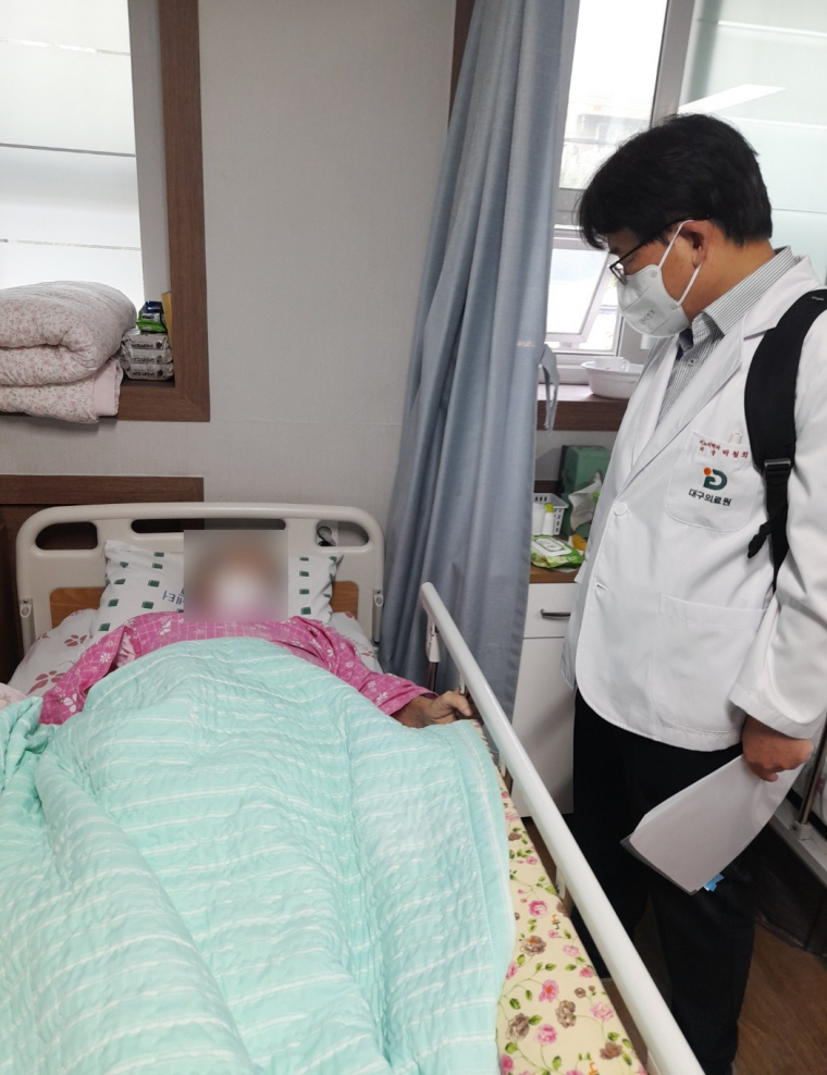 대구의료원 의사선생님들께서 방문해주셔서 생활실 어르신들의 상태를 진찰하고 계시는 모습입니다.